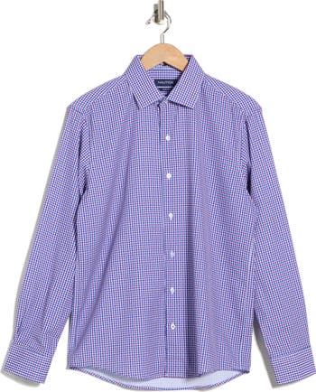 You'll look sharp in a snap in this crisp dress shirt featuring a check pattern.