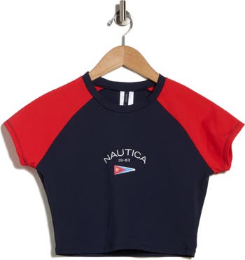Surf, swim and stay protected in this cropped rashguard framed by raglan sleeves and finished with a logo chest graphic.