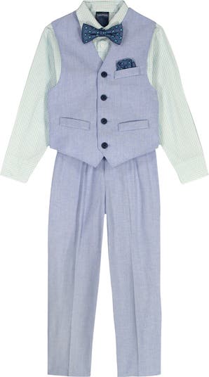 Give your kid sharp style with this perfectly coordinated set including a button-up shirt, bow tie, vest and matching pants.