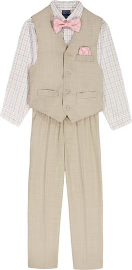 Your kiddo will look picture-perfect at their next special occasion with this suiting-style set featuring a checkered button-up, a bowtie and a sharkskin waistcoat with matching pants.