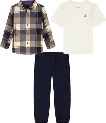 Breathable cotton-rich fabric keeps your trendsetting kiddo comfortable in this coordinating set that pairs a short-sleeve T-shirt, button-up flanel and woven pull-on pants.