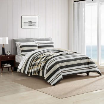 Refresh your bedroom or guest room with this striped comforter and wrinkle-resistant sheet set that includes a plush throw for a coordinated look.