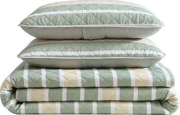 Bring serene, coastal-inspired styling to your bedroom with this lightweight breathable diamond-quilted set with seafront stripes that reverses to a minipinstripe pattern.