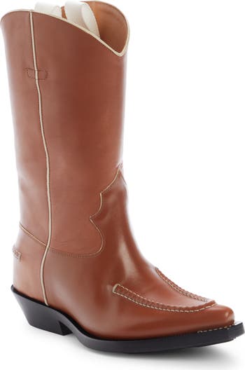 Ornate paneling finished with hand-sewn pickstitches and a low Cuban heel add Western flair to this tall boot crafted in Italy from calfskin leather.