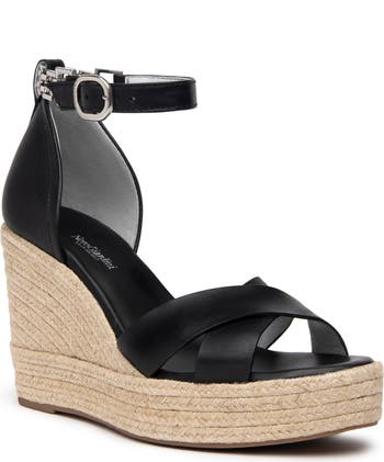 Shiny links detail the ankle strap of a warm-weather sandal lofted by an espadrille-style wedge that's perfect for your next sunny getaway.