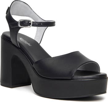 Gleaming logo hardware at the back strap makes a signature statement on a retro leather sandal lifted by a chunky platform and block heel.