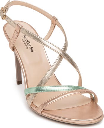 Asymmetrical straps in gleaming metallic hues heighten the modern style of a sleek sandal lifted by a stiletto heel.