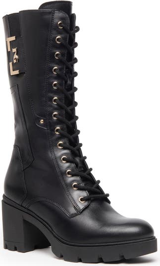 Gleaming logo hardware highlights a smooth leather moto boot lifted by a chunkly block heel and lugged platform sole.