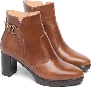 Signature logo hardware details the ankle of a rich leather bootie lifted by a subtle platform and block heel.