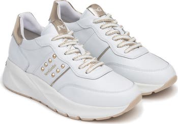 A removable insole allows room for custom orthotics within an Italian-crafted sneaker shaped from soft leather detailed with studded hardware and a glinting logo to elevate your casual looks.