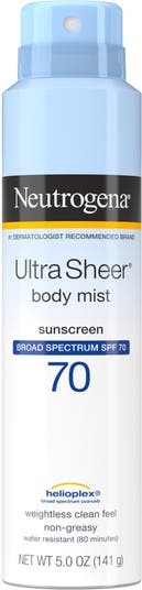 Neutrogena Ultra Sheer Body Mist Sunscreen Spray with Broad Spectrum SPF 70 provides powerful sun protection that you will love to wear to help prevent sunburn. Made with Helioplex technology, this non-greasy sunscreen provides superior UVA/UVB protection in an easy-to-use spray format. The sunscreen spray formula also absorbs quickly with a sheer, ultralight finish and a weightless, clean feel. This SPF 70 sunscreen mist is non-comedogenic and oil-free, so it won't leave a heavy residue or clog pores and, when used as directed, may decrease the risk of skin cancer caused by the sun. Convenient for on-the-go, the easy-to-use spray can provides no-mess application for face and body. This spray sunscreen is water-resistant up to 80 minutes and comes from the #1 dermatologist recommended suncare brand. Apply prior to sun exposure to keep skin protected. Packaging and formulation may vary. New formula contains no oxybenzone and uses avobenzone for optimal protection from UVA & UVB rays. Can of Neutrogena Ultra Sheer Body Mist Broad Spectrum SPF 70 Sunscreen Spray - Size: 5 oz. - For directions and ingredients, see "Additional Info" - Imported