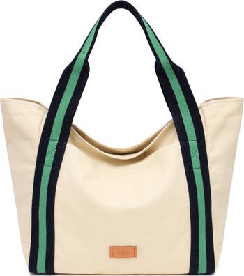 Striped straps bring a sporty touch to this roomy cotton-canvas tote bag fashioned with a secure top-zip closure and convenient slip pockets.