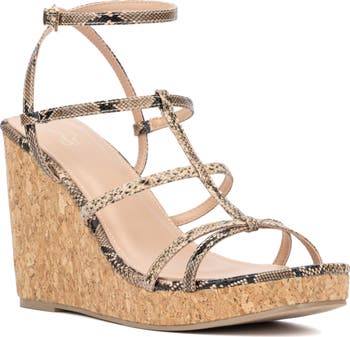 A cork platform wedge sole elevates a strappy open toe sandal that is designed for comfort and support for all-day wear.