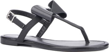 A slim-soled slide sandal is secured with an ankle strap and features a mixed metallic bow to ensure eye-catching appeal.