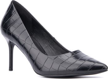 A pointed toe pump with reptile embossment is balanced upon a stiletto heel.
