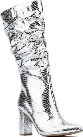 A sharply pointed toe defines this sassy boot designed with a ruched shaft and comfortable block heel.