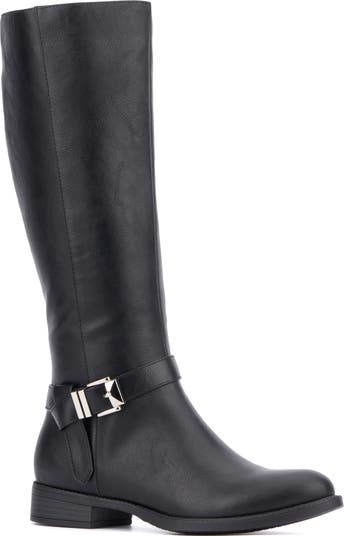 A gleaming buckled strap details this knee-high boot that's fitted with a side zipper and balanced upon a chunky block heel.
