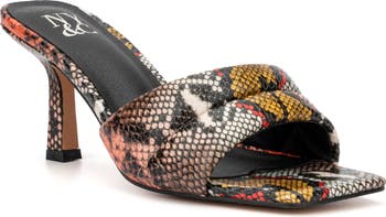 A quilted puffy vamp adds modern style to this square toe bed slide sandal.