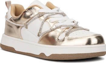 Metallic overlay stands out against the low-top silhouette of a glamorous sneaker framed by a platform sole.
