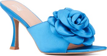 A jaunty flower brings dimension to the eye-catching vamp of this square toe sandal set atop a slim stiletto heel.