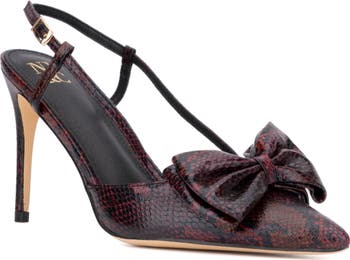 A playful bow details the pointed toe of this sky-high pump designed in a slingback silhouette.