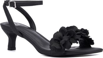 Jaunty flowers bring dimension to the eye-catching top strap of this square toe sandal set atop a low kitten heel.
