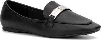 An engraved metal tag accents the vamp of this faux leather loafer for sleek look.