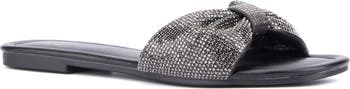 A rhinestone bow vamp strap and metallic footpad give a slim-soled slide sandal a bright and shining finish to comfortably elevate any outfit.