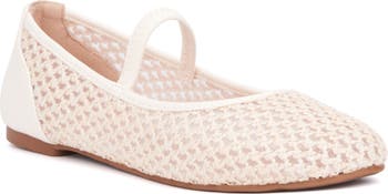 A stretchy top strap brings comfortable wear to a woven mary jane flat shaped by a plain toe for a minimalist silhouette.