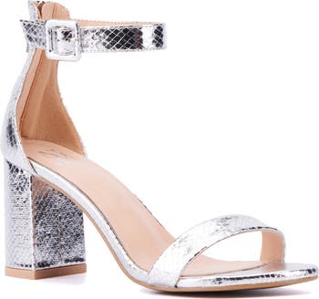A minimalistic single vamp band and ankle buckle strap creates classic style on an open toe sandal finished with a chunky high heel.