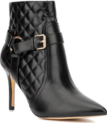 Diamond quilting elevates this faux leather bootie balanced upon a stiletto heel.