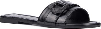 A slim-soled slide sandal is secured with a wide vamp strap and features a rhinestone buckle to ensure eye-catching appeal.