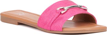 A gleaming horse-bit buckles adds an elegant detail to a slim-soled slide sandal.