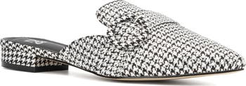 A diamond-shaped buckle accents across this houndstooth mule with a pointed toe.