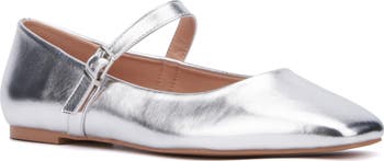 A square-toe ballet flat offers easy-wear comfort with a midfoot buckle strap and soft foam cushioning.
