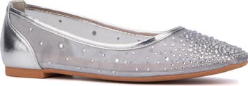 Tonal rhinestones stand out against the mesh upper of a glamorous flat framed by a squared-off toe.