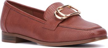 A gleaming buckle brings sophisticated style to a square-toe loafer constructed from soft or textured faux leather.