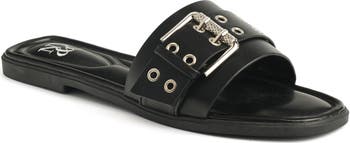 Polished grommets and a mixed-texture buckle bring a dose of edge to a minimalist slide sandal shaped from sleek faux leather.
