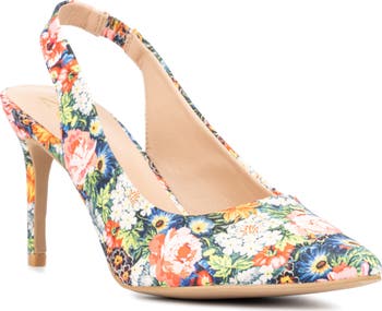 A timeless slingback design is updated with a colorful snake embossed finish and sleek pointed toe for a modern twist.