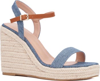 Two-tone ankle straps add a modern touch to these lofty sandals styled with a jute-wrapped wedge and platform.