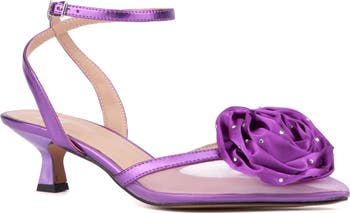 A pointed toe and svelte ankle strap make this flower-topped pump a perfectly poised option for any occasion.