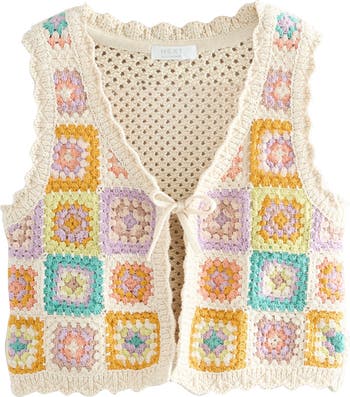 Crocheted granny squares in pastel hues bring throwback charm to a cotton sweater-vest that features airy, open-stitched knitting on the back.