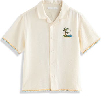 Your vacationing child will look stylish dining on the veranda in this textured button-up shirt featuring an island palm-tree graphic.