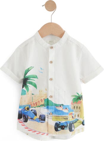 A certain racing event from the south of France is illustrated on a cool linen-and-cotton shirt that's finished with a stylish band collar.