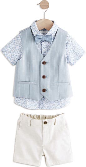 A short-sleeve oxford shirt, textured bow tie, waistcoast-style vest and stretchy glen-plaid chino shorts keep your child dapper, comfortable and always photo-ready. The bow tie goes on easily with a hook-and-loop closure, while the shorts feature an adjustable waist that allows for growth.
