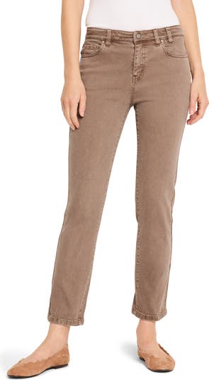 Washed to create lived-in color, these stretchy jeans feature a mid-rise waist and slim-cut straight legs that end near the ankles.
