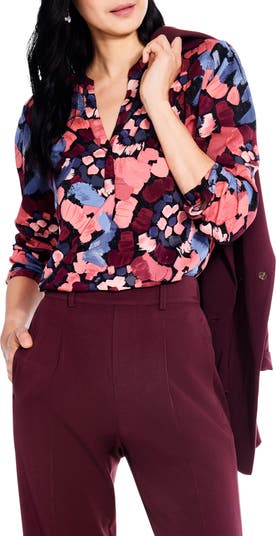 Brush-stroke blooms in autumnal hues enliven a popover top fashioned with a band collar.