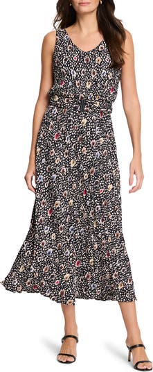A colorful poppy pattern adds breezy charm to a sleeveless A-line dress featuring a subtle crinkle texture and matching belt for added structure.