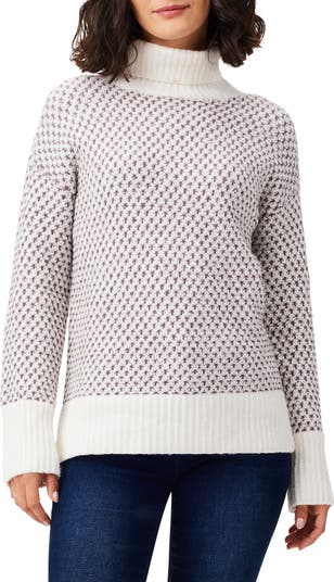 Solid ribbed trim perfectly frames a spotted turtleneck sweater knit in a slouchy fit with dropped shoulders.