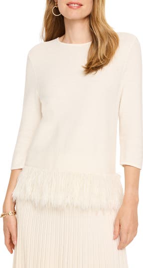 Trimmed with a hem of feather fringe, this polished sweater knit from cotton-rich yarns just may inspire you to put an extra shimmy in every step.